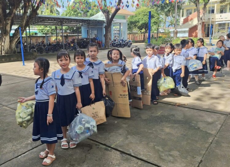Tại khuôn viên trường Tiểu học và Trung học cơ sở Nhơn Thạnh, phường Phú Khương, tỉnh Vĩnh Long, không khí trở nên rộn ràng hơn thường lệ. Các em học sinh tay cầm những bao rác thải nhựa đã được phân loại gọn gàng – nào chai nhựa, ly nhựa, túi nilon… Tất cả được mang đến để đổi lấy những phần quà là dụng cụ học tập trong chương trình “Đổi rác thải nhựa lấy quà tặng”.