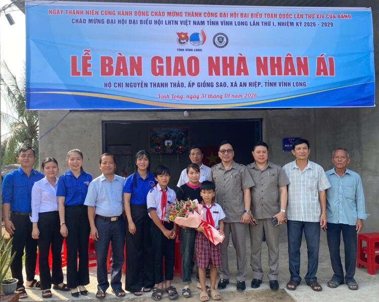 Sáng ngày 31/01/2026, Ban Thường vụ Tỉnh đoàn, Ban Thư ký Ủy ban Hội LHTN Việt Nam tỉnh Vĩnh Long đã phối hợp Hiệp hội Nghiên cứu, Tư vấn về Chính sách, pháp luật cho hoạt động đầu tư tại Việt Nam (AVRCIPL); Viện Nghiên cứu Thị trường – Truyền thông Quốc tế (IMRIC) và Viện Nghiên cứu Chính sách pháp luật&Kinh tế hội nhập (IRLIE) tổ chức Lễ bàn giao công trình Nhà nhân ái cho hộ gia đình chị Nguyễn Thanh Thảo – gia đình có hoàn cảnh khó khăn về nhà ở tại ấp Giồng Sao, xã An Hiệp, tỉnh Vĩnh Long. Công trình chào mừng thành công Đại hội Đại biểu toàn quốc lần thứ XIV của Đảng và chào mừng Đại hội Đại biểu Hội LHTN Việt Nam tỉnh Vĩnh Long lần thứ I, nhiệm kỳ 2026 – 2029.