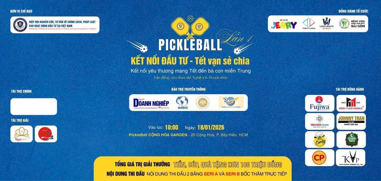Giải Pickleball “Kết nối đầu tư – Tết vạn sẻ chia” lần 1 năm 2026 do Hiệp hội Nghiên cứu, Tư vấn Chính sách, Pháp luật cho hoạt động đầu tư tại Việt Nam (AVRCIPL) chủ trì, chỉ đạo – doHệ thống siêu thị Mẹ và Bé Dũng Jerry và Công ty TNHH Hoá mỹ phẩm Thiên Long phối hợpTập đoàn Longbeach World và Bệnh viện Răng Hàm Mặt Sài Gòn (RHM) đồng tổ chức, với quy mô toàn quốc…Với định hướng kết nối, phát triển lâu dài trong cộng đồng Doanh nhân, Nghệ sĩ, Truyền thông báo chí. Mục tiêu hướng đến 1000 phần quà, sẻ chia đón tết cùng bà con có hoàn cảnh khó khăn miền Trung và khu vực lân cận Tp.HCM.