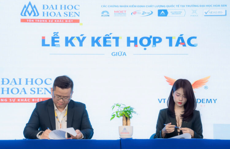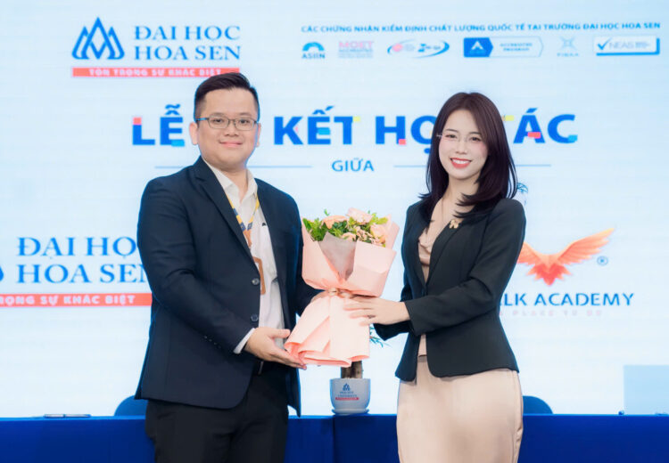 Thạc sĩ Đoàn Ngọc Duy – Phó Hiệu Trưởng Đại học Hoa Sen ký kết hợp tác với Thạc sĩ Võ Thị Mỹ Duyên – Giám đốc Đào tạo Học viện Kỹ năng VTALK