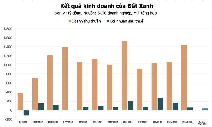 Ở chiều ngược lại, nhiều doanh nghiệp khác chưa ghi nhận đột biến. Đất Xanh được dự báo đạt khoảng 45 tỷ đồng lợi nhuận, giảm nhẹ so với cùng kỳ do vẫn phụ thuộc vào mảng môi giới và chưa có nhiều sản phẩm bàn giao.