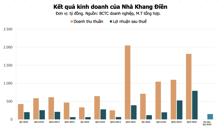 Nhà Khang Điền được dự báo đạt khoảng 150 tỷ đồng lợi nhuận, tăng 23% so với cùng kỳ, chủ yếu nhờ bàn giao các sản phẩm thấp tầng tại dự án Gladia by the Waters (liên doanh với Keppel) đã bán trước đó. Hoạt động bán hàng mới chưa thực sự sôi động khi giá trị sản phẩm cao và người mua có xu hướng thận trọng hơn trong môi trường lãi suất cao.