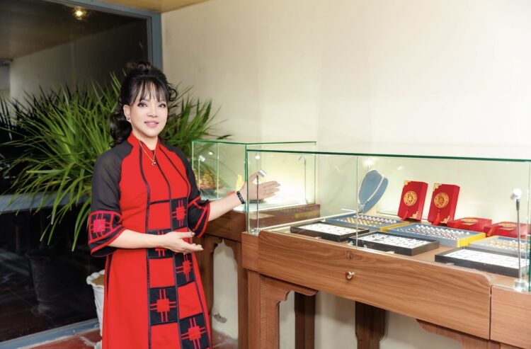 Nghệ nhân kim hoàn quốc gia Hồ Thị Thanh Hương bên các sản phẩm tự tay chế tác được giới thiệu tại showroom