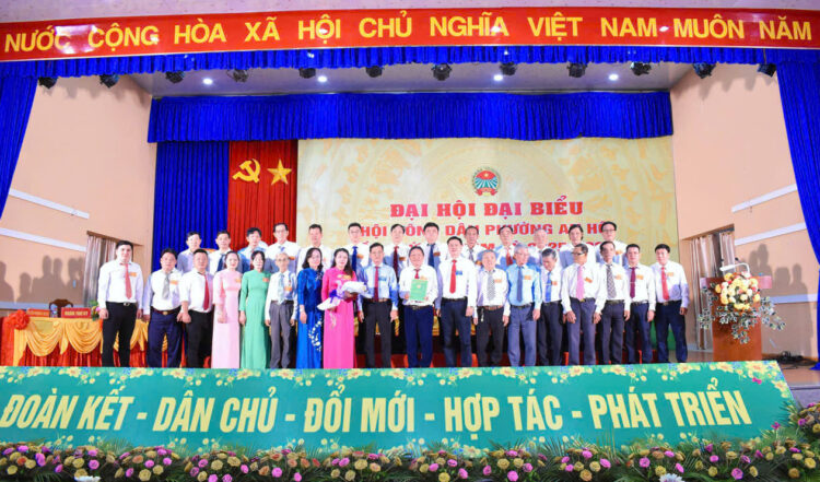 Lãnh đạo tỉnh hội và đảng ủy phường trao hoa chúc mừng Ban Chấp hành Hội Nông dân phường An Hội khóa I, nhiệm kỳ 2025 – 2030