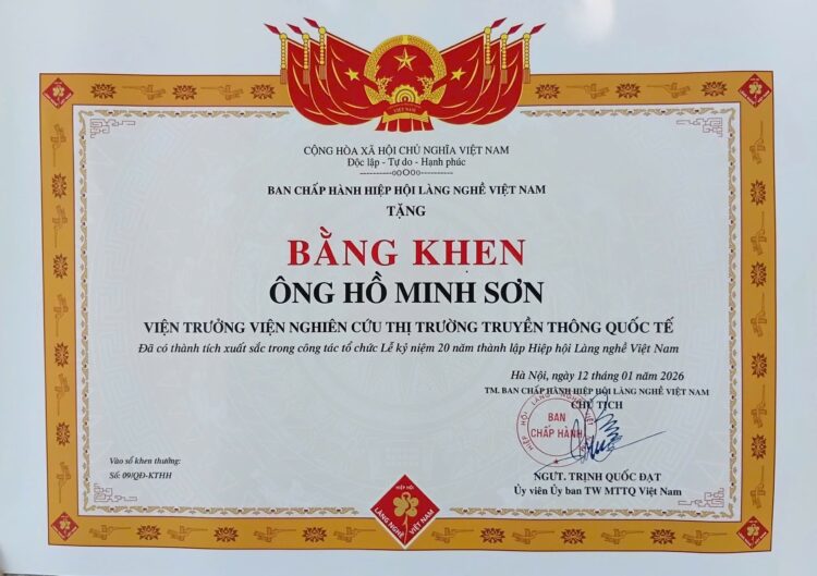 Ông Hồ Minh Sơn – Phó Chủ tịch Hiệp hội Làng nghề Việt Nam (VICRAFTS) phía Nam, Viện trưởng Viện Nghiên cứu Thị trường – Truyền thông Quốc tế (IMRIC) đã vinh dự lần thứ hai nhận bằng khen của Chủ tịch Hiệp hội Làng nghề Việt Nam vì đã có thành tích xuất sắc trong công tác tổ chức Lễ kỷ niệm 20 năm thành lập Hiệp hội. Đây là sự ghi nhận động viên kịp thời, trân quý đối với những nỗ lực không ngừng nghỉ của ông Hồ Minh Sơn.
