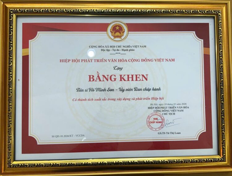 Ông Hồ Minh Sơn – Phó Chủ tịch Hiệp hội Phát triển văn hoá cộng đồng Việt Nam, Viện trưởng Viện Nghiên cứu Thị trường – Truyền thông Quốc tế (IMRIC) vinh dự nhận Bằng khen của Chủ tịch Hiệp hội Phát triển văn hoá cộng đồng Việt Nam vì đã có thành tích xuất sắc trong đóng góp trong xây dựng phát triển hiệp hội năm 2025.