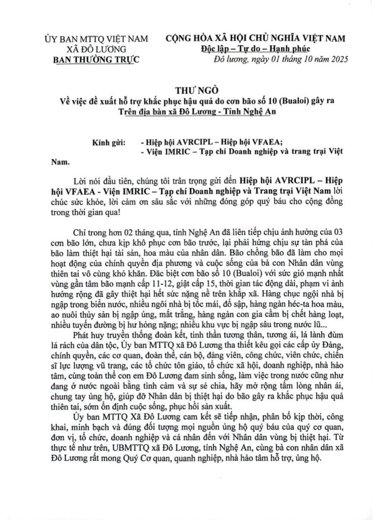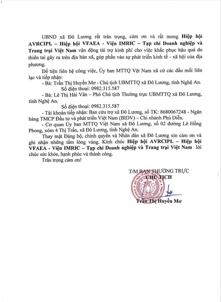 Tích cực hưởng ứng lời kêu gọi của Uỷ ban Mặt trận Tổ quốc Việt Nam xã Đô Lương (tỉnh Nghệ An), phát huy truyền thống đoàn kết quý báu với tinh thần “tương thân tương ái”, Hiệp hội Nghiên cứu, Tư vấn về Chính sách, pháp luật cho hoạt động đầu tư tại Việt Nam (AVRCIPL); Viện Nghiên cứu Thị trường – Truyền thông Quốc tế (IMRIC); Viện Nghiên cứu Chính sách pháp luật&Kinh tế hội nhập (IRLIE); Trung tâm tư vấn pháp luật Toàn Tâm (TTLCC) và Trung tâm tư vấn pháp luật Minh Sơn (TTTVPLMS) đã nhanh chóng phát động kêu gọi hội viên hiệp hội, các doanh nghiệp thành viên thuộc Câu lạc bộ doanh nhân IMRIC – IRLIE, Câu lạc bộ Báo chí Truyền thông&Chính sách pháp luật và cộng đồng doanh nghiệp đồng hành, các tổ chức xã hội bằng những sự sẻ chia, giúp đỡ về tinh thần, vật chất, góp phần hỗ trợ đồng bào khắc phục thiệt hại do bão số 10 gây ra.