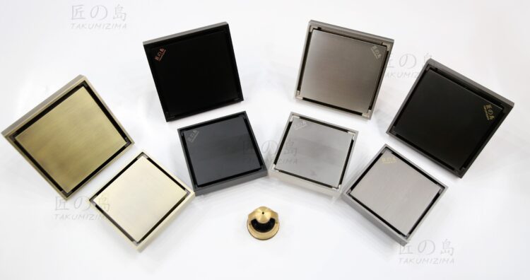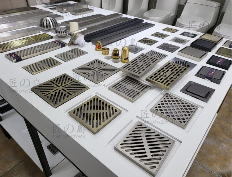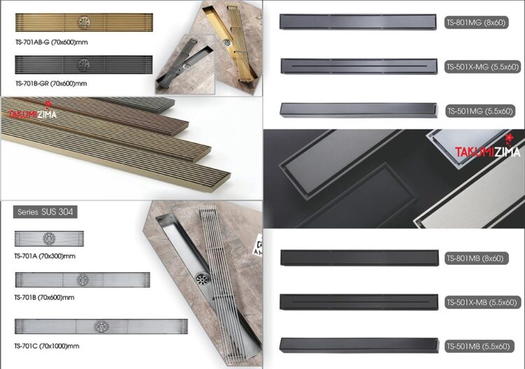 Nổi bật nhất chính là mẫu thoát sàn táng hình (Hay còn gọi là ghép gạch): Takumizima chính là đơn vị đi đầu cho thiết kế thông minh khi mặt thoát có thể ốp chính viên gạch của sàn nhà mình lên tạo nên bề mặt đồng nhất, liền mạch giúp sàn tắm trở nên hoàn hảo.