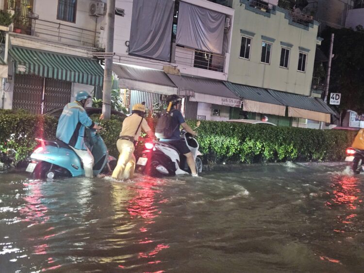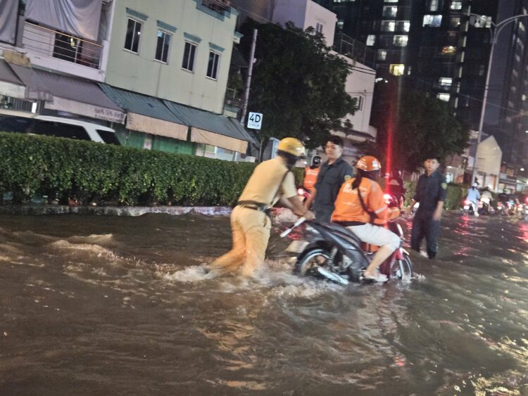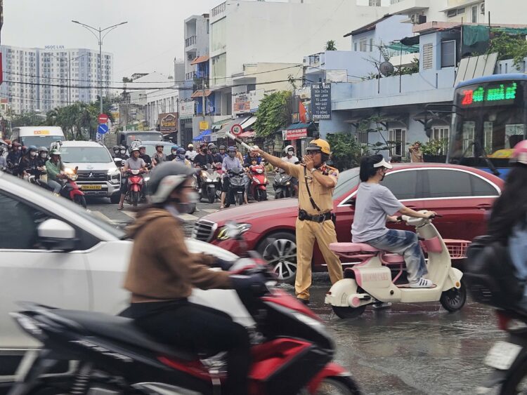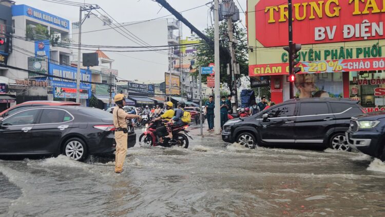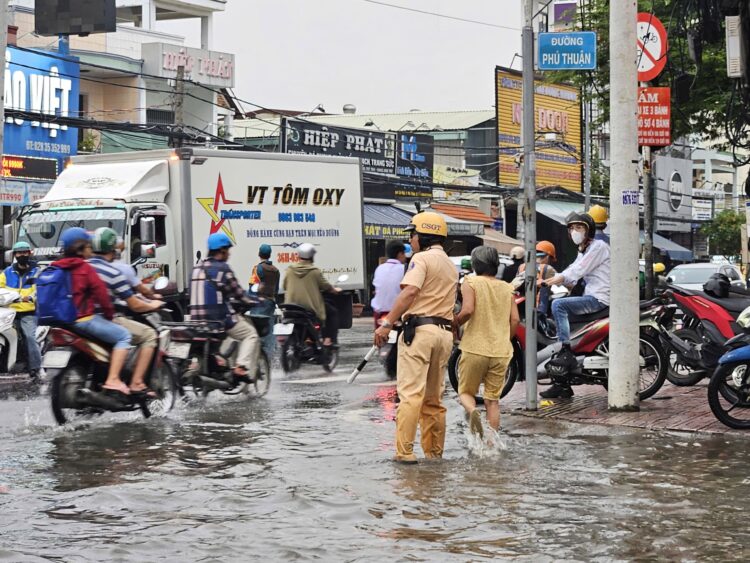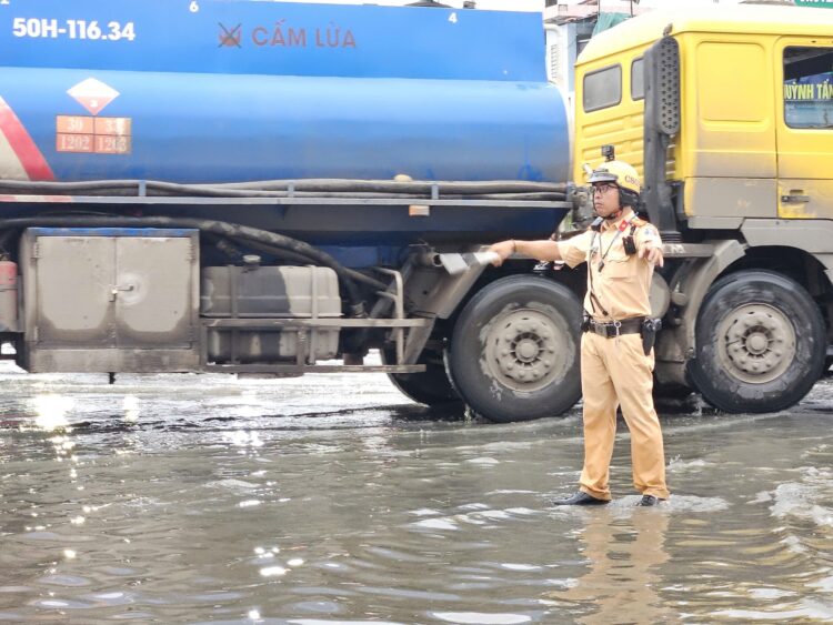 Trong tình hình triều cường dâng cao, tình trạng ngập nước tại một số tuyến đường diễn ra nghiêm trọng trong những ngày qua, dẫn đến người dân đi lại khó khăn, nhất là tình trạng mưa lớn kéo dài khi vào khung giờ cao điểm, lượng phương tiện tập trung đông đúc vì người dân đi làm, về nhà và đưa đón con đi học dẫn đến giao thông di chuyển khó khăn, tiềm ẩn nhiều nguy cơ gây mất TTATGT.