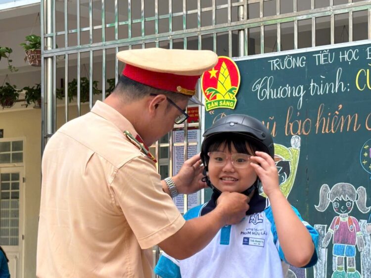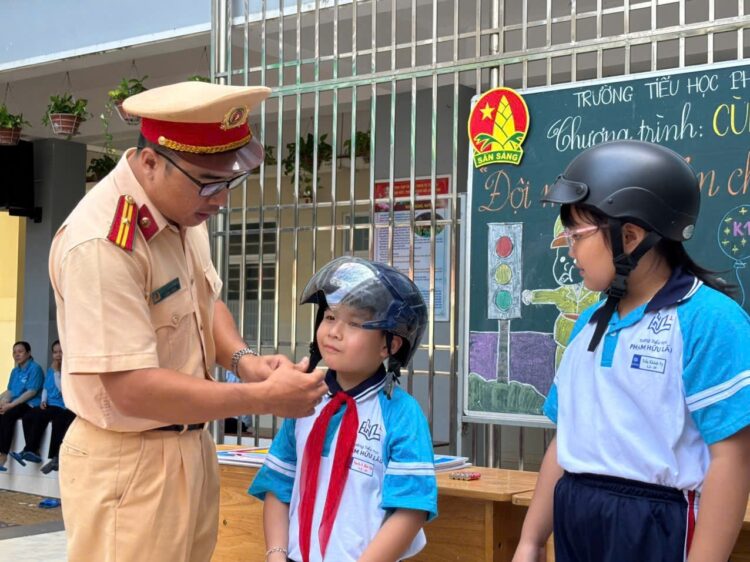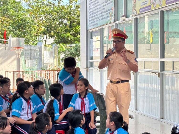 Trạm CSGT Đa Phước phối hợp công an phường Tân Mỹ (sau sáp nhập) tuyên truyền an toàn giao thông học đường tại trường tiểu học Phạm Hữu Lầu